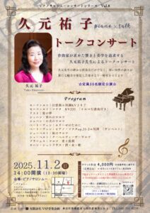 コンサートシリーズVol.8はピアニスト・久元祐子先生をお迎えしトークコンサートを開催いたします。